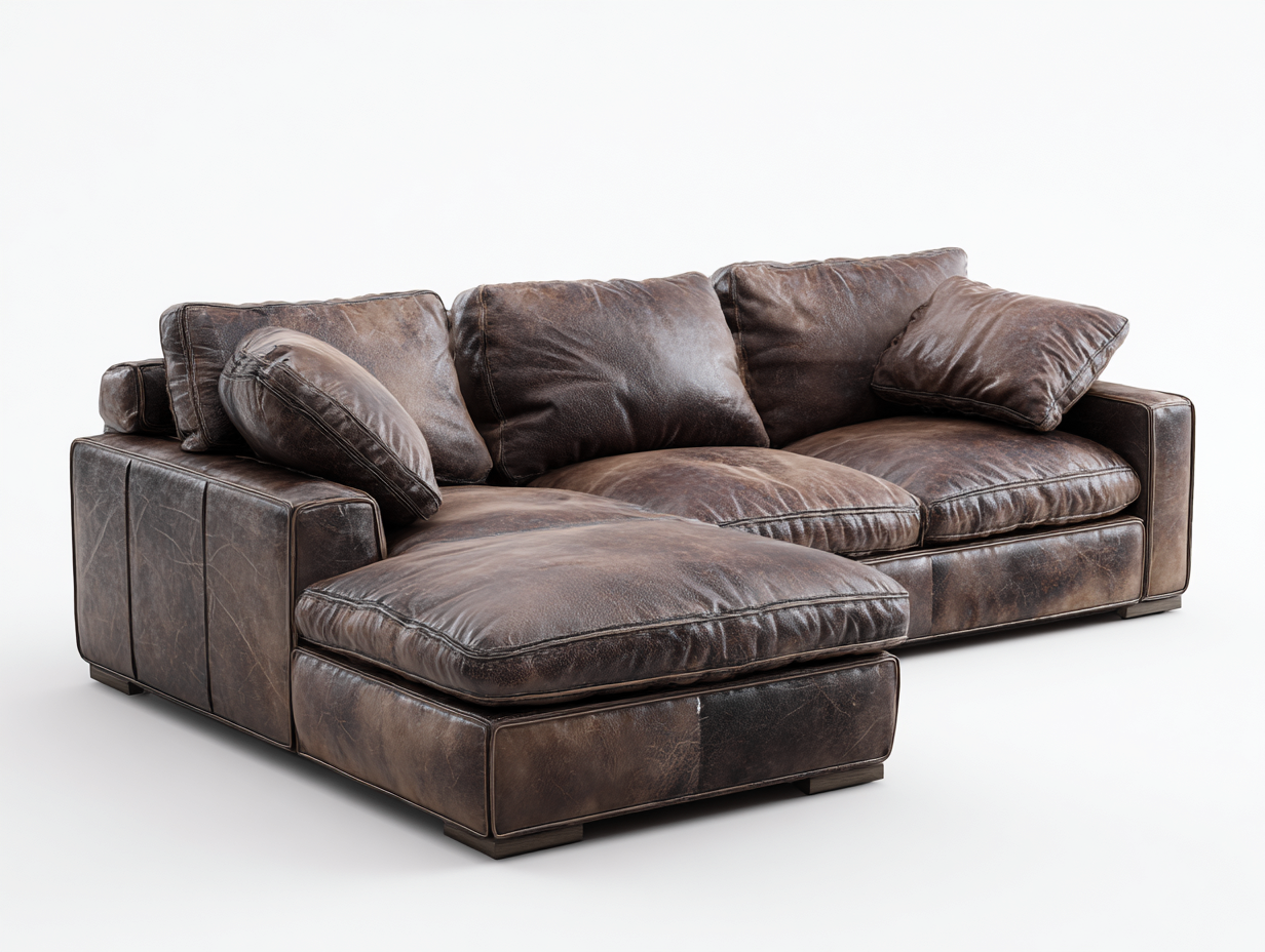 The sofa is upholstered in leather with a brown finish, combined with a sturdy internal frame designed for long-term stability. The surface shows a natural texture that enhances its visual character.